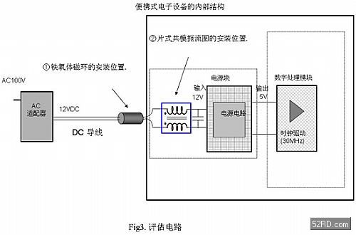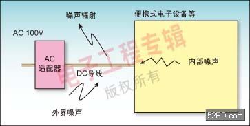 一般說來,便攜式電子設備內部的噪聲是通過DC電源線以共模的方式輸出的,像在AC適配器導線上,其噪聲可以用共模噪聲濾波器進行有效抑制。