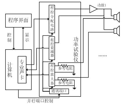 常見的專業聲卡一般只具備兩個輸入通道,兩個輸出通道,而功率試驗要求能夠同時對多個通道進行測試,故需要分配電路實現信號選擇;此外,專業聲卡的電壓工作范圍在1至2伏之間,揚聲器的實際工作電壓和工作電流有較大的變化范圍,因此需要進行電平變換才能和聲卡連接。綜合這些因素,需要一套獨立的功率試驗儀和聲卡相配合,才能完成測試功能。功率試驗儀內部由程控分配電路、程控衰減器、程控放大器、通訊端口、電源電路和接線端子等部分組成。整個硬件平臺結構如圖1所示。