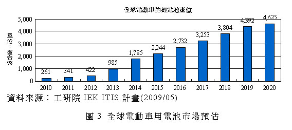 再者,根據2020年全球電動車年銷售量300萬量的規模,以70%為PHEV及30%為純電動車(BEV)的電池需求預估,則2020年全球車用電池的產值為4,625億臺幣如圖3所示。
