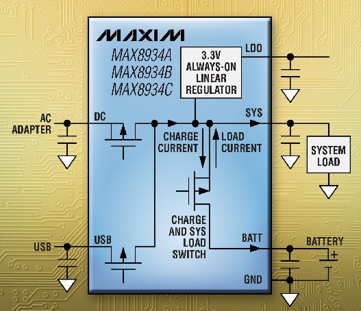 Maxim推出業內首款集成智能電源選擇器(Smart Power Selector)電路的雙輸入線性充電器MAX8934,器件符合JEITA (日本電子信息技術產業協會)推薦標準,能夠在各種溫度條件下實現安全充電。MAX8934監測電池溫度,根據溫度的變化自動將充電電流和充電終止電壓調節到安全水平。連接外部電源時,智能電源選擇器電路允許系統在無電池或電池深度放電的情況下工作,自動將系統負載由電池切換至外部電源。器件集成了充電以及在電池與外部電源之間切換負載所需的所有電流檢測電路和功率開關,可為智能電話、數碼相機、多媒體播放器、游戲系統及GPS導航系統等采用單節Li+電池供電的手持設備提供理想的緊湊方案。
