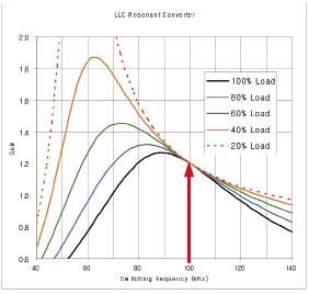 利用PFC級,LLC轉換器的輸入可設置在400V左右。如果所需輸出電壓為12V、匝數比為40:1,則額定負載下需要1.2的DC增益。無論負載情況如何,頻率始終不變。