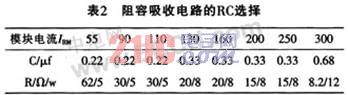 模塊過壓保護一般也可采用阻容吸收法。對于持續時間較短,能量不大的過電壓,一般可在模塊兩端并聯阻容吸收電路,用吸收電容把過電壓的電磁能量變成靜電能量存貯起來。而用吸收電阻不但可以防止電路振蕩,還可限制晶閘管導通時電容放電所產生的開通損耗和di/dt值。并聯在晶閘管開關模塊的RC值可參考表2。