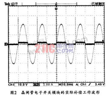在無功補償實際應用中,可將晶閘管電子開關模塊用在TSC低壓無功補償以替代接觸器,這樣,就可以在開關電壓過零時投入補償電容量,從而避免了沖擊電流的產生和瞬間電網電壓的波動。圖2所示是其工作波形圖。