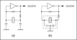 圖1給出了兩個(gè)皮爾斯振蕩器的實(shí)例。圖1a是一個(gè)典型的晶體振蕩電路,使用外部電容和電阻。圖1b則是一個(gè)基于三端陶瓷諧振器的皮爾斯振蕩器,陶瓷諧振器中集成了補(bǔ)償電容。這些設(shè)計(jì)中的每一個(gè)元件的值與工作頻率、供電電壓、反相器的類(lèi)型、元件類(lèi)型(晶體或諧振器)以及制造商有關(guān)。