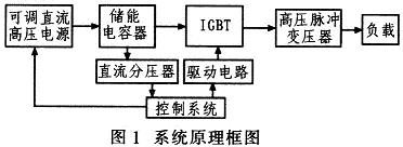 系統(tǒng)工作過(guò)程如下:由控制系統(tǒng)控制可調(diào)直流高壓電源給儲(chǔ)能電容器充電,當(dāng)充電電壓達(dá)到設(shè)定值后,再控制IGBT按照設(shè)定的頻率和脈沖寬度導(dǎo)通,產(chǎn)生脈沖電壓加在高壓脈沖變壓器原邊,最后由高壓脈沖變壓器升壓,產(chǎn)生所需的高壓脈沖加在負(fù)載上。