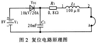 圖2中,V1為低壓直流電源,R1為限流電阻。由V1通過(guò)R1提供一個(gè)直流電流給單匝復(fù)位線圈A。在高壓脈沖變壓器工作時(shí),單匝線圈A上會(huì)感應(yīng)較高的電壓,利用電感L1,電容C1和高壓硅堆VD1對(duì)低壓直流電源V1進(jìn)行保護(hù)。