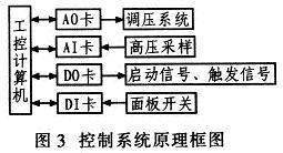 控制系統(tǒng)原理框圖如圖3所示。通過(guò)計(jì)算機(jī)控制AO卡(模擬量輸出)輸出0~10V的模擬量,用來(lái)控制調(diào)壓系統(tǒng)中的可控硅調(diào)壓器的輸出。儲(chǔ)能電容器上的電壓經(jīng)過(guò)高壓采樣和AI卡(模擬量輸入),由計(jì)算機(jī)采集。計(jì)算機(jī)控制DO卡(數(shù)字量輸出)輸出控制信號(hào)控制各類啟動(dòng)開(kāi)關(guān)和IGBT驅(qū)動(dòng)板輸出觸發(fā)信號(hào)。各類手動(dòng)面板的開(kāi)關(guān)信號(hào)經(jīng)過(guò)DI卡(數(shù)字量輸入),由計(jì)算機(jī)采集。
