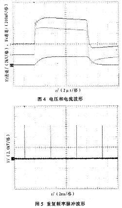 對(duì)系統(tǒng)各部分進(jìn)行調(diào)試。用高壓探頭測(cè)試電壓波形,用羅果夫斯基線圈測(cè)試電流波形。測(cè)試的實(shí)驗(yàn)波形如圖4、圖5和圖6所示。