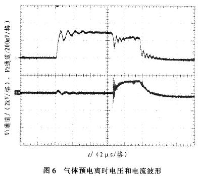 圖4中,縱坐標(biāo)為電壓幅度值(2通道2kV/格,4通道200mV/格)。通道2為電壓波形,電壓約為5kV,脈沖寬度為10μs,上升沿小于lμs。通道4為電流波形,電流值約85A(波形圖中比例為l:500)。圖5中,脈沖周期為5ms,重復(fù)頻率為200Hz。圖6中,縱坐標(biāo)為電壓幅度值(1通道5kV/格,2通道2V/格)。l通道為放電電壓波形,2通道為放電電流波形。從波形圖中可以看出,脈沖當(dāng)電壓加在氣體上時(shí),大約經(jīng)過(guò)幾微秒時(shí)間后,氣體發(fā)生電離。此時(shí)由于分壓原因,電壓幅值略有下降,電流波形開(kāi)始出現(xiàn)。在脈沖電壓加載期間,氣體維持了電離狀態(tài)。