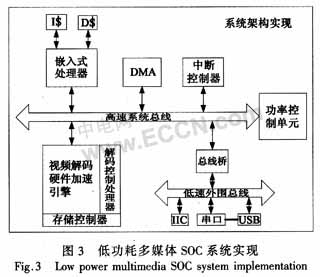 在多媒體SOC中,為了保證服務質量,系統的設計目標必須是面向最高負載情況。然而在實際運行過程中,視頻解碼器、中央處理器以及一些外設經常處于不活動或者低負載狀態,這無疑白白消耗了一些能量。為解決該問題,EDA公司對Multi-Vt以及Muhi-Vdd等低功耗設計技術提供更有力的支持,IP供應商對同一IP核也提供了豐富配置以滿足不同應用需求,同時Foundry也提供了更豐富的標準單元庫以及工藝。在進行低功耗多媒體SOC設計的過程中,設計者所要做的就是充分利用這些技術優勢,盡可能地去開發可利用的低功耗設計空間。