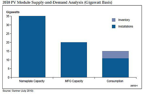 據市場調研公司Gartner表示,光伏組件制造商所聲稱的”售罄”情形及生產設備滿負荷運轉的情形,與光伏組件實際的生產供應情況極為不符。Gartner表示,光伏組件的實際生產供應量約為20GW至24GW,而2010年預計新增安裝量僅為11GW多一點。由于兩個數據并不相互吻合,因此,Gartner擔憂市場將無法達到供需平衡。