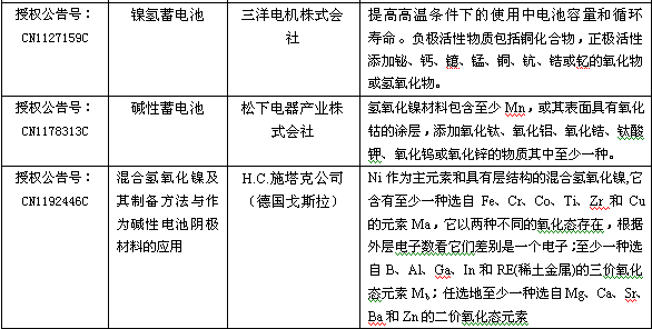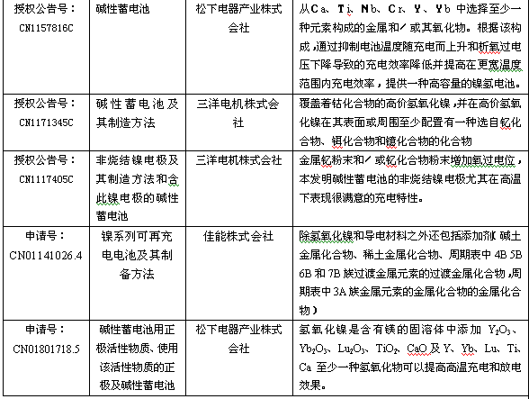 在電池配料時,通過機械混合法添加周期表中ⅡA、ⅢB、ⅣB、ⅦB、ⅧB、ⅡB主族元素和3、4、5周期的元素、氧化物或氫氧化物,能較好地提高或改善鎳氫高溫性能。世界著名電池制造公司在華申請授權的專利中多有介紹,如日本松下、三洋;中國比亞迪;德國H.C.施塔克等公司。詳細見下表: