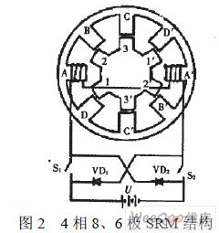 另外,當主開關(guān)器件S2導通時,A相繞組從直流電源U吸收電能,而當S1、S2關(guān)斷,繞組電流經(jīng)續(xù)流二極管VD1、VD2繼續(xù)流通,并回饋給電源U。此,SR電動機傳動的共性特點是具有再生作用,系統(tǒng)效率高。
