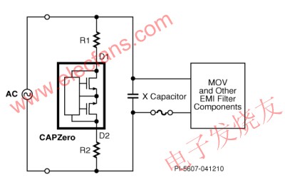 要想實現待機電流接近零的目標,就必須找到能消除R1和R2連續電流消耗的解決方案。PowerIntegrations新推出的CAPZeroIC可以輕松實現這一點。圖2所示為CAPZero在典型應用中的使用情況。