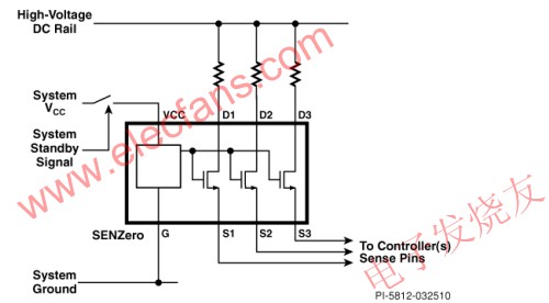 在消除市電輸入的電流消耗之后,接下來需要消除電路中的那些即使在待機狀態下也會連續消耗功率的其他元件的電流消耗。在較高功率應用中,在高壓母線與功率因數校正(PFC)和DC/DC轉換器的電源控制器之間可能存在多條信號通路。例如包括PFC系統中連接升壓控制器的前饋或反饋信號通路,以及雙開關正向/LLC/半橋和全橋轉換器中的前饋信號通路。PI的第二款新產品是SENZero,它可以在不需要這些信號通路時將它們隔離,從而消除不必要的功率損耗。SENZero的典型應用如圖4所示。