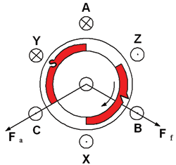 得知Hall輸出信號與轉子磁動勢位置的關系之后,可以產生正六邊形的旋轉磁場,如圖4所示,AB相繞組通電,產生圖中合成磁勢Fa,由于Fa的牽引,Ff將會順時針旋轉,旋轉到X位置后,換成給AC相通電,則Fa順時針跳躍60°電角度,牽引Ff順時針旋轉60°,依次類推,通電順序按照AB-AC-BC-BA-CA-CB-AB循環,則帶動永磁轉子順時針旋轉。這就是傳統的方波控制方式。
