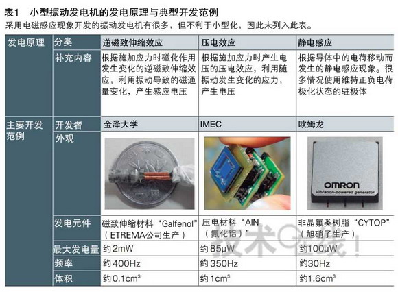 日本金澤大學上野敏幸副教授開發(fā)出了尺寸雖小卻可獲得較大發(fā)電量的振動發(fā)電機。盡管外形尺寸僅為約2mm×3mm×12mm,但振動頻率達到約400Hz時卻可獲得約2mW的發(fā)電量(表1)。