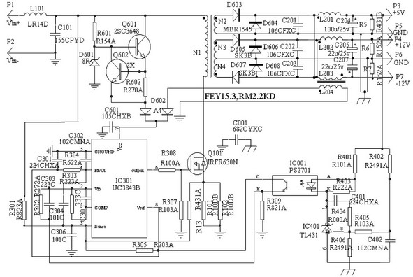 電源工作原理為:電路采用單端正激變換電路,當變換器接通電源時,輸入直流電壓經由電阻、12V穩壓管D601和三極管Q601、Q602組成的電路穩壓降壓后, 啟動UC3843進入正常工作,偏置繞組L204的供電電路開始工作,輸出經A4和C601整流及濾波后輸出12V電壓,高于自供電電壓,使二極管A4反偏,啟動電路停止工作。變換器進入正常工作后,電源依據PWM脈寬調制方式工作,次級繞組的輸出經過二極管整流以及電容器和電感器組成的LC型濾波器濾波后,產生所需的各路輸出直流電壓。+5V的輸出電壓由電阻器R402和R406分壓后,與可編程穩壓源TL431(U3)中的2.5V參考電壓比較,然后通過光耦合器U2反饋到UC3843的2腳,控制脈沖的占空比,穩定5V輸出。耦合電感L202和L203實現+/-12V兩路穩壓。過流保護電阻R101、R102檢測到開關管的過流信號,送入3843的3腳,封鎖UC3843的輸出信號,實現過流保護。