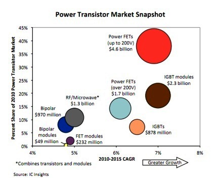 根據(jù)IC Insight的預(yù)測,整體功率電晶體市場營收將在2010至2015年間,取得6.4%的復(fù)合年平均成長率(CAGR),在2015年達(dá)到163億美元規(guī)模;同時期低電壓(200V以下)功率FET市場CAGR為6.7%,到2015年?duì)I收規(guī)模可達(dá)164億美元。