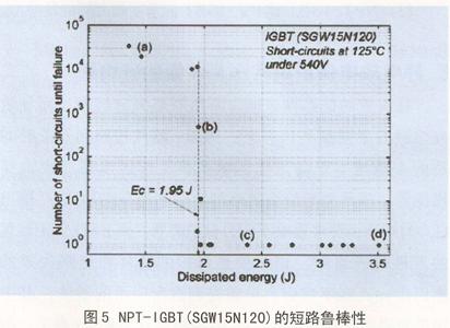 NPT—IGBT的魯棒性見圖5,被測器件是SGW15N120。在540V 125℃時(shí)測試。X軸是耗散的能量。Y軸是器件直至損壞的短路周期次數(shù)。