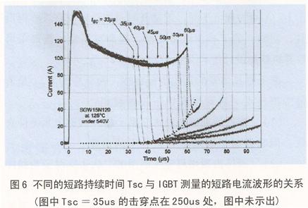 圖6給出不同短路續(xù)時(shí)間TSC,IGBT測量的短路電流波形。