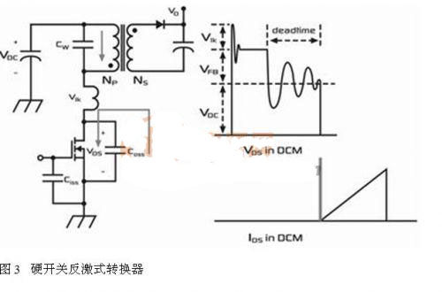 圖3示出傳統(tǒng)硬開關反激式轉換器。在這種傳統(tǒng)的間斷模式反激式轉換器 (DCM) 的停滯時間期間,寄生電容將與VDC周圍的主要電感發(fā)生振蕩。寄生電容上的電壓會隨振蕩而變化,但始終具有相當大的數(shù)值。當下一個時鐘周期的MOSFET 導通時間開始時,寄生電容 (COSS和CW) 會通過MOSFET放電,產生很大的電流尖峰。由于這個電流出現(xiàn)時MOSFET存在一個很大的電壓,該電流尖峰因此會做成開關損耗。此外,電流尖峰含有大量的諧波含量,從而產生EMI。[page]