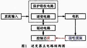 圖1為典型的逆變器結構原理圖。它由三部分組成:逆變電路、驅動保護電路、控制與信號采集電路。