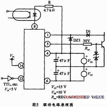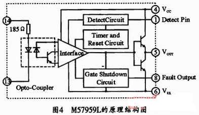 M57959L是日本三菱公司生產的混合集成IGBT驅動器,其內部原理結構如圖4所示。它由高速光電隔離輸入,絕緣強度高,可與TTL電平兼容。內藏定時邏輯短路保護電路,并具有保護延時特性。芯片由正負電源供電,克服了單電源供電時負電壓不穩的缺點,驅動功率大,可驅動200A/600V或100A/1200V的IGBT模塊。由M57959L構成的驅動電路如圖5所示。