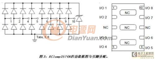 升特公司的最新以太網(wǎng)保護(hù)方案RClamp2574N可滿足并超過所有上述要求。建議將其放置于變壓器的PHY端,盡可能靠近磁體。RClamp2574N可配置為保護(hù)一個千兆以太網(wǎng)的全部四對差分線對。如圖3所示,八個I/O引腳中的每一個都有一個低電容的控向二極管對,該器件用來將有害的浪涌電流引入內(nèi)部的低壓TVS二極管。控向二極管的工作電壓僅有2.5V,采用升特公司專利的EPD工藝技術(shù)制造。低壓導(dǎo)通是一個很重要的保護(hù)參數(shù),因?yàn)楹芏郟HY芯片都集成了ESD保護(hù)結(jié)構(gòu)。這些結(jié)構(gòu)并非針對承受很大的電能而設(shè)計(jì)。如果它們在外部保護(hù)實(shí)