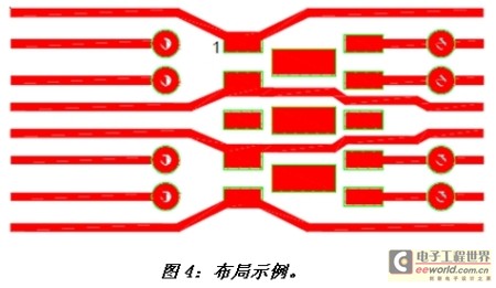 圖4顯示了RClamp2574N的流通型PCB走線。信號線連接到第1、2、4、5、6、7、9和10腳。第3腳與8腳連接到三個中心接地。在一個典型以太網(wǎng)應(yīng)用中,這些引腳以及接地都應(yīng)懸空(即不接地)。在本例中,走線寬度為0.005英寸。過孔用于第6、7、9和10腳的換層連接,這樣所有八根信號線都可采用易于實(shí)現(xiàn)的流通型(flow though)布局。