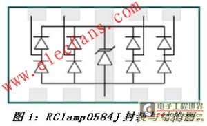 RClamp0584J是這種集成式TVS保護(hù)器件的一個最佳實(shí)例(圖1)。該器件是RailClamp系列高速接口保護(hù)產(chǎn)品的最新成員。這種四線、5V工作電壓保護(hù)器件的性能超出了IEC 6100-4-2 level 4對靜電瞬變的保護(hù)要求。圖1同時(shí)也明確顯示,這款器件采用了獨(dú)特的封裝設(shè)計(jì)。“穿通型(Flow through)”封裝一詞來自升特公司,這種封裝允許走線直接穿過保護(hù)器件,因此最大限度地減小了由于平衡差分線對的中斷或失配所導(dǎo)致的額外寄生電感與電容。