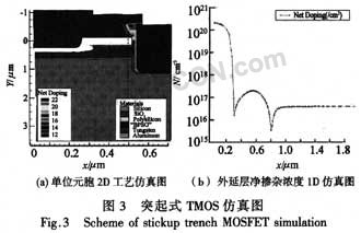 當相鄰單位元胞尺寸不斷縮小后,尤其在設計柵極氧化膜較薄的器件時,在傳統的TMOS工藝中,源區注入會穿透柵極側壁影響器件性能。采用突起式結構可以有效地避免刻蝕工藝及源區注入對較短溝道器件的間接影響,消除了器件穿通的風險,保證了器件的穩定性能和可重復性。