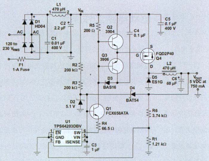 圖 1 顯示了完整的轉(zhuǎn)換器。整流器電路使用一個(gè)標(biāo)準(zhǔn)、快速開關(guān)整流器二極管橋接 (D1) 和一個(gè)LC濾波器(L1和C2),我們將對(duì)其余組件進(jìn)行更加詳細(xì)的介紹。