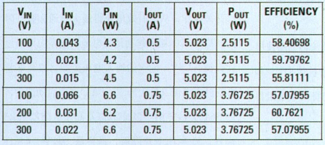 電容C4值設(shè)定大于Q4的柵極電容,但其必須足夠小,以便在更短控制器最小導(dǎo)通與斷開時(shí)間期間能夠得到再充電。圖3顯示了300V和500mA負(fù)載輸入電壓下,一個(gè)開關(guān)周期的柵極和漏極導(dǎo)通/斷開時(shí)間。表1顯示了測(cè)得的轉(zhuǎn)換效率。