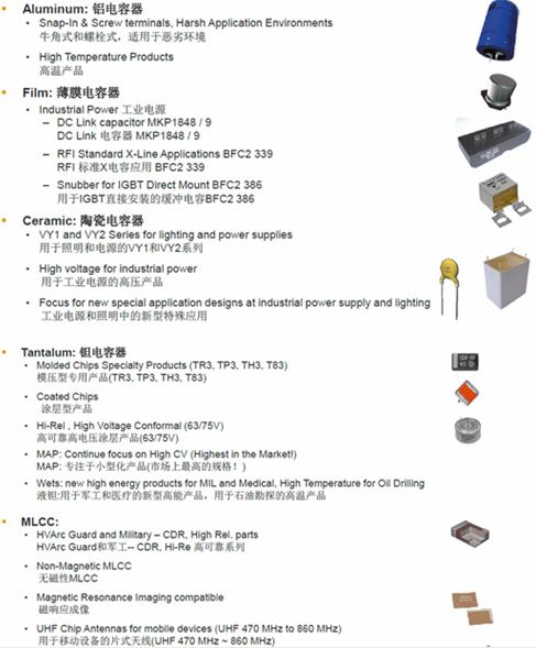 在光伏逆變器和風電變流器中,DC-link薄膜電容可用作穩壓濾波,預期壽命大于15年,具有更低的損耗,更好的穩定性,而且用4~6薄膜電容 MKP1848/9就能替換掉采用60~80個電解電容器的老式設計;101/102 PHR-ST非常適合高功率開關轉換器中的直流母線電容器和脈沖電源應用中的能量儲存。除新能源領域外,Vishay還給我們帶來了高可靠鉭電、高可靠MLCC在軍工、逆變器、列車牽引機等一些領域上的應用與選型。
