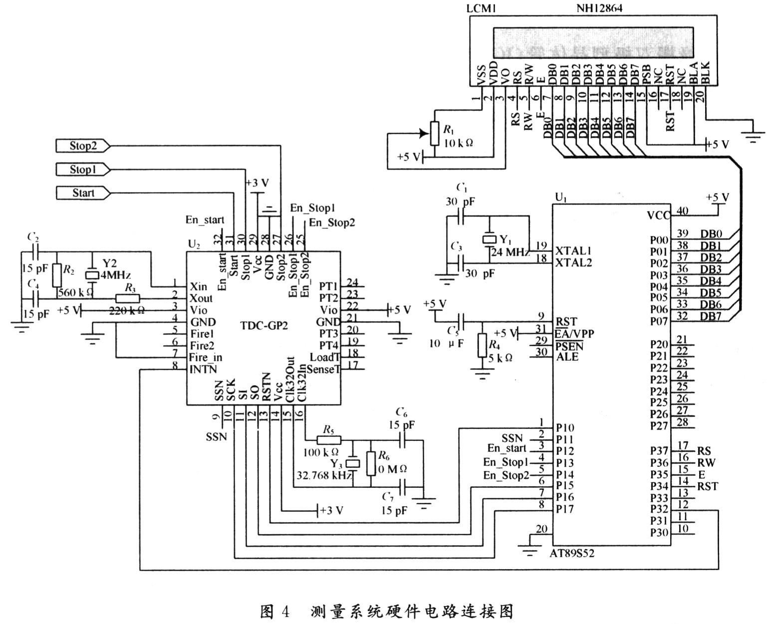 系統主要由脈沖信號取樣器、脈沖輸入信號整形電路、TDC-GP2測量電路、AT89S52單片機、液晶顯示電路、電源電路、時鐘電路組成。TDC-GP2的每個測量通道都提供一個使能引腳,可獨立地設置這兩個引腳進行通道選擇。TDC-GP2需要一個2~8 MHz的高速時鐘進行校準用。TDC-GP2只是在進行時間測量時才必須用振蕩器,且能夠自動控制振蕩器的開啟時間。整個系統的硬件電路連接如圖4所示。