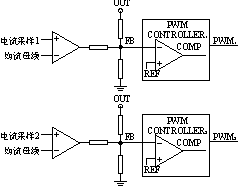 通過檢測(cè)RC網(wǎng)絡(luò)中C兩端的電壓,作為電流信號(hào),幾路電流信號(hào)(本例只有兩路)通過一個(gè)相同的電阻就得到了平均值均流母線,平均值均流母線電壓值與負(fù)載有關(guān),表征負(fù)載電流的大小。然后將每路采樣來的電流信號(hào)與母線電壓比較,得到誤差信號(hào),去修正輸出電壓參考信號(hào),從而對(duì)PWM控制器的占空比輸出進(jìn)行微調(diào),達(dá)到均流和穩(wěn)壓的目的。
