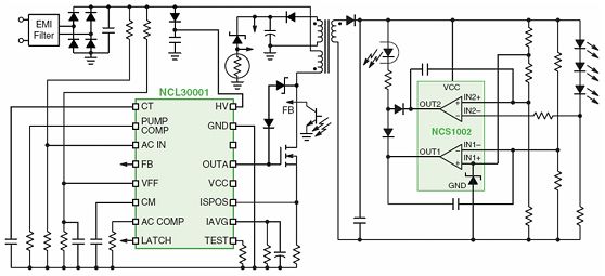 區(qū)域照明應(yīng)用除了采用分布式/模塊化方案之外,還可采用整體式/單段式方案。例如可以采用安森美半導體的NCL30001功率因數(shù)校正TRIAC可調(diào)光LED驅(qū)動器。
