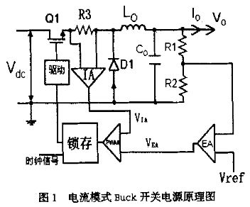 開關(guān)電源可以有很多種結(jié)構(gòu),但原理基本相似。圖1是電流模式降壓斬波fg(Buck)開關(guān)電源的原理圖。它和電壓模式的主要區(qū)別是增加了電流采樣電阻R3和電流放大器IA. R3的阻值一般很小,以避免大的功耗。功率管Ql在每個周期開始的時候開啟并維持一段時間Ton,通過濾波電感Lo對濾波電容C。充電、同時向負載提供電流,此時Lo上電流隨時間的變化率為