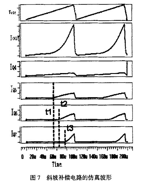 圖7是在選取了元件尺寸后計算機仿真波形。其中Vosc是理想化的鋸齒波,Iout是輸出的補償電流,IQ4、IQ5、IQ6、 IQ7分別是Q4, Q5, Q6和Q7的漏極電流,可以看到,為了在占空比小于50%的時候系統(tǒng)更加穩(wěn)定,Q4在每個周期開始時就已經(jīng)開啟,但是電流的斜率較小。隨著Vosc以恒定的斜率上升,將先后在t1, t2, t3時達到Q5, Q6和07的開啟點。設(shè)Q4, Q5, Q6, Q7開啟后的電流斜率分別為m4, m5, m6和m7,