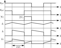 當(dāng)原邊開(kāi)關(guān)管S1及S2均開(kāi)通時(shí),能量?jī)?chǔ)存在輸入濾波電感中,同時(shí)輸出整流管處于關(guān)斷態(tài)。當(dāng)開(kāi)關(guān)管S1及S2中任一個(gè)開(kāi)關(guān)管關(guān)斷時(shí),儲(chǔ)存能量通過(guò)原邊繞組傳輸?shù)礁边叀S捎谧儞Q器的對(duì)稱(chēng)工作,變壓器磁通得以復(fù)位平衡。