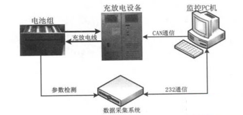 測試平臺的結構如圖1所示,以單片機為核心的電池數(shù)據(jù)采集系統(tǒng)直接對電池組的單體電壓、總電壓、溫度、電流、充放電容量、充放電能量等信息進行精確測量,并通過RS232總線將數(shù)據(jù)發(fā)送到上位機。由微型計算機構成的上位機監(jiān)控系統(tǒng), 實時顯示并記錄接收到的測試數(shù)據(jù), 對數(shù)據(jù)進行分析,監(jiān)控測試系統(tǒng)工作狀態(tài)。另外可根據(jù)具體的實驗要求,控制充放電設備按照編程指令輸出電流,模擬電池在某些特定條件下的使用情況。充放電設備實現(xiàn)電池組的充放電, 完成電池和電網(wǎng)之間能量的雙向流動, 與監(jiān)控PC 機通過CAN 通信, 可接收監(jiān)控PC機的編程控制指令。文中主要完成數(shù)據(jù)采集系統(tǒng)、上位機監(jiān)控系統(tǒng)的設計并實現(xiàn)各部分之間的實時通訊。