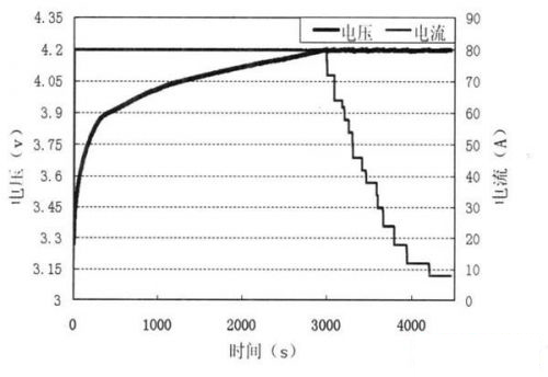 為了測試該系統(tǒng), 使用3. 7V /80Ah的錳酸鋰電池做恒流恒壓充電試驗。在上位機程序中設置如下參數(shù): 恒流階段充電電流80A, 充電截止電壓4. 2V,恒壓階段截止電流0. 1A, 得到的充電曲線如圖4所示。