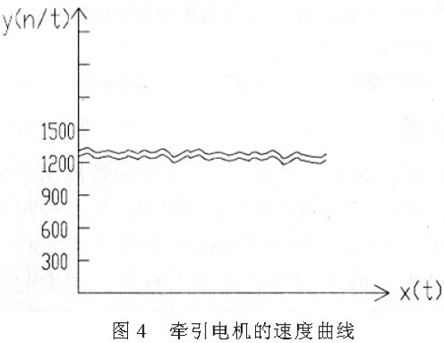 利用 STEP7 編制PLC 上位機監(jiān)控程序,Wincc采集速度值并繪制曲線。數據提取的時間間隔為15ms。實際上牽引電機1 和牽引電機2 速度是相同的, 但為了反映牽引電機2 的跟蹤和波動情況, 在此特地將其分開, 上面是牽引電機1 的速度曲線, 下面是牽引電機2 的速度曲線(見圖4) 。牽引電機1 的速度發(fā)生變化時, 牽引電機2 就能及時地響應, 進行跟蹤, 并且能很快地達到穩(wěn)定。實驗表明, 采用PLC 和變頻器的控制方法, 能達到較高的同步要求, 響應快、速度波動幅度較小。