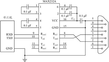 串口是計算機上一種非常通用設備通信的協(xié)議,大多數(shù)計算機包含2個基于RS232的串口,PC的串行口是RS232C電平,而單片機的串行口是TTL電平,兩者之間通過串口通信時,必須進行電平轉(zhuǎn)換,設計運用MAX232A芯片完成單片機與PC之間的數(shù)據(jù)傳輸,硬件連接電路如圖6所示。