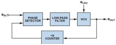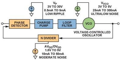 鎖相環(huán)(PLL)是現(xiàn)代通信系統(tǒng)的基本構建模塊PLLs通常用在無線電接收機或發(fā)射機中,主要提供"本振"(LO)功能;也可用于時鐘信號分配和降噪,而且越來越多地用作高采樣速率模數(shù)或數(shù)模轉換的時鐘源。由于每一代PLL的噪聲性能都在改善,因此電源噪聲的影響變得越來越明顯,某些情況下甚至可限制噪聲性能。本文討論圖1所示的基本PLL方案,并考察每個構建模塊的電源管理要求。