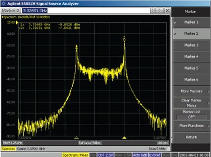 另一種方法:將低頻方波直流耦合至電源內(nèi),同時觀察VCO頻譜任一側上的頻移鍵控 (FSK)調(diào)制峰值(圖2)。峰值間頻率偏差除以方波幅度,便得出VCO推壓系數(shù)。該測量方法比靜態(tài)直流測試更精確,因為消除了與直流輸入電壓變化相關的任何熱效應。圖2顯示ADF4350 VCO輸出在3.3 GHz、對標稱3.3 V電源施加10 kHz、0.6 V p-p方波時的頻譜分析儀曲線圖。對于1.62 MHz/0.6 V或2.7 MHz/V的推壓系數(shù),最終偏差為3326.51 MHz – 3324.89 MHz = 1.62 MHz.該結果可與表1中的靜態(tài)測量 2.3 MHz/V比較。