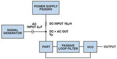 電荷泵的低功耗使其看似頗具吸引力,可使用升壓轉換器從較低的電源電壓產(chǎn)生高電荷泵電壓,然而與此類DC-DC轉換器相關的開關頻率紋波可能在VCO的輸出端產(chǎn)生干擾雜散音。高PLL雜散可能造成發(fā)射機發(fā)射屏蔽測試失敗,或者降低接收機系統(tǒng)內(nèi)的靈敏度和帶外阻塞性能。為幫助指導轉換器紋波的規(guī)格,使用圖6的測量設置針對各種PLL環(huán)路帶寬獲得全面電源抑制曲線圖與頻率的關系。