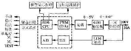 系統(tǒng)工作在開環(huán)狀態(tài),利用8098的PWM口,經(jīng)濾波后輸出一個0~5V的控制電壓信號給觸發(fā)板,使整流橋相應(yīng)輸出電壓為0~300V.該方式主要用于系統(tǒng)主電路的檢修和維護(hù)。