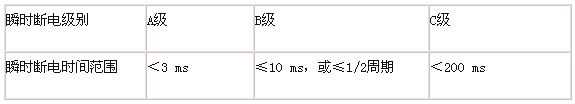 工業(yè)現(xiàn)場的供電品質(zhì)很差,常常不能達到國家對電網(wǎng)波動等級中規(guī)定的最低標(biāo)準(zhǔn)C級。表1列出了國家標(biāo)準(zhǔn)對電網(wǎng)波動等級的規(guī)定。當(dāng)供電電壓超過C 級規(guī)定時,通常稱為過壓或者欠壓。而失壓又稱瞬時斷電。產(chǎn)生瞬時斷電,最常見的原因是用電設(shè)備突然短路而它的保險絲還沒有熔斷的瞬間。另外開關(guān)或刀閘觸點接觸不良或顫抖等也會產(chǎn)生瞬間斷電。瞬間斷電所允許時間國內(nèi)尚無標(biāo)準(zhǔn),表2列出了日本《工業(yè)用計算機環(huán)境標(biāo)準(zhǔn)》中規(guī)定的瞬間斷電級別。